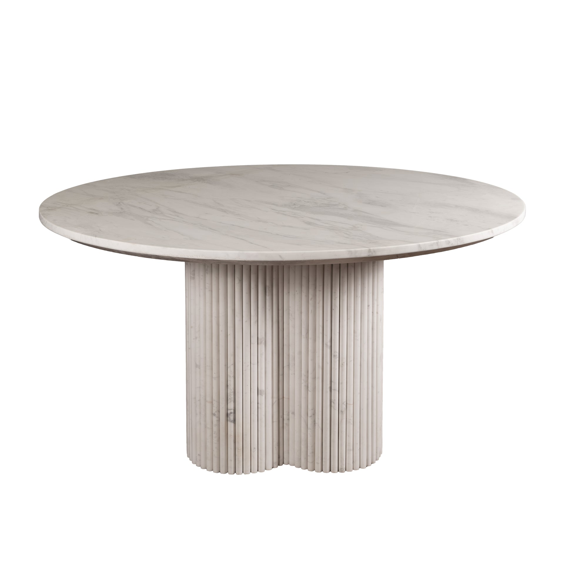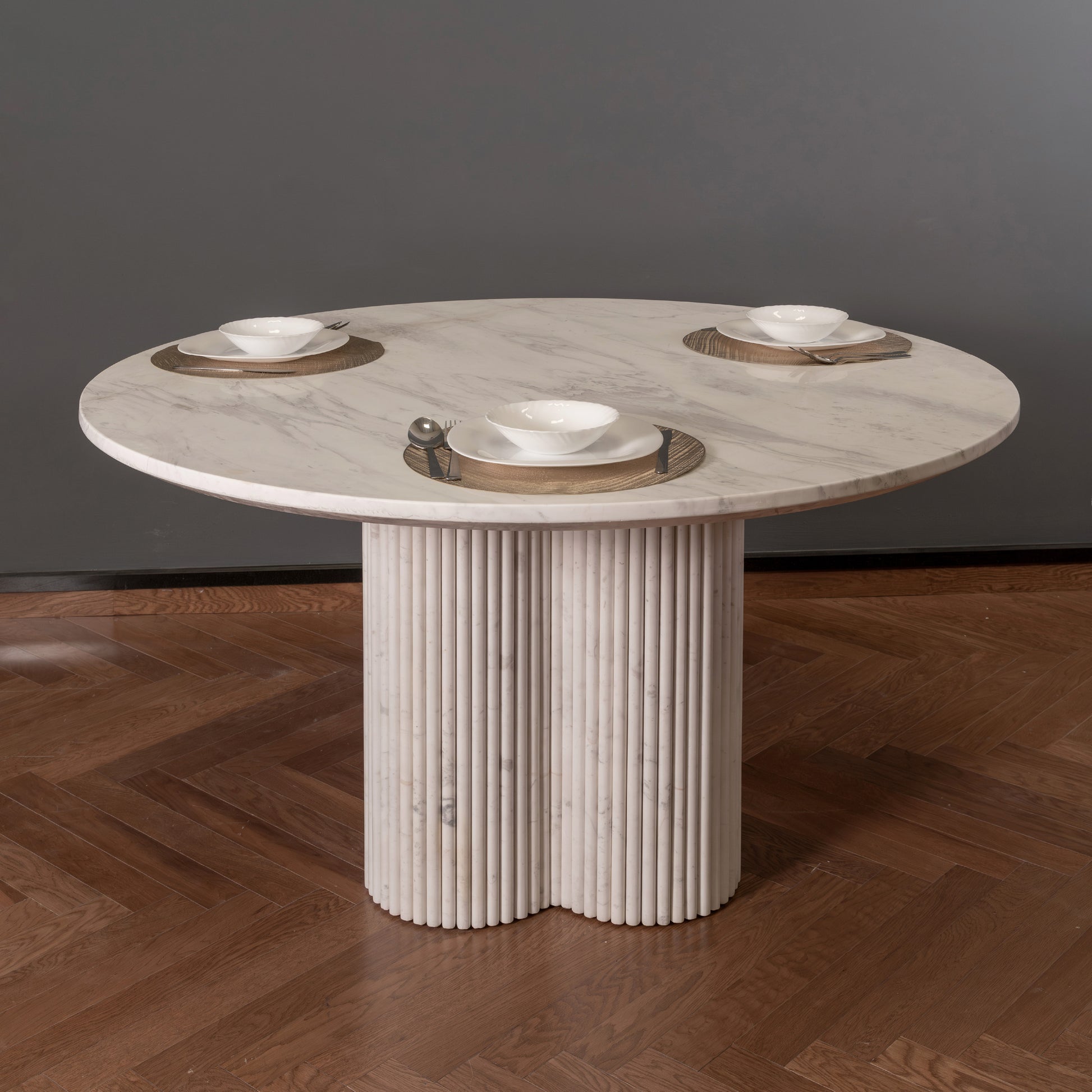 The statement fluted base adds architectural depth and texture, creating a striking contrast with the polished surface above. Designed with precision and a focus on harmony, the Celeste Table seamlessly blends modern minimalism with classic marble craftsmanship, making it a standout piece in luxury dining rooms, open-concept homes, lounges, and contemporary villa interiors.