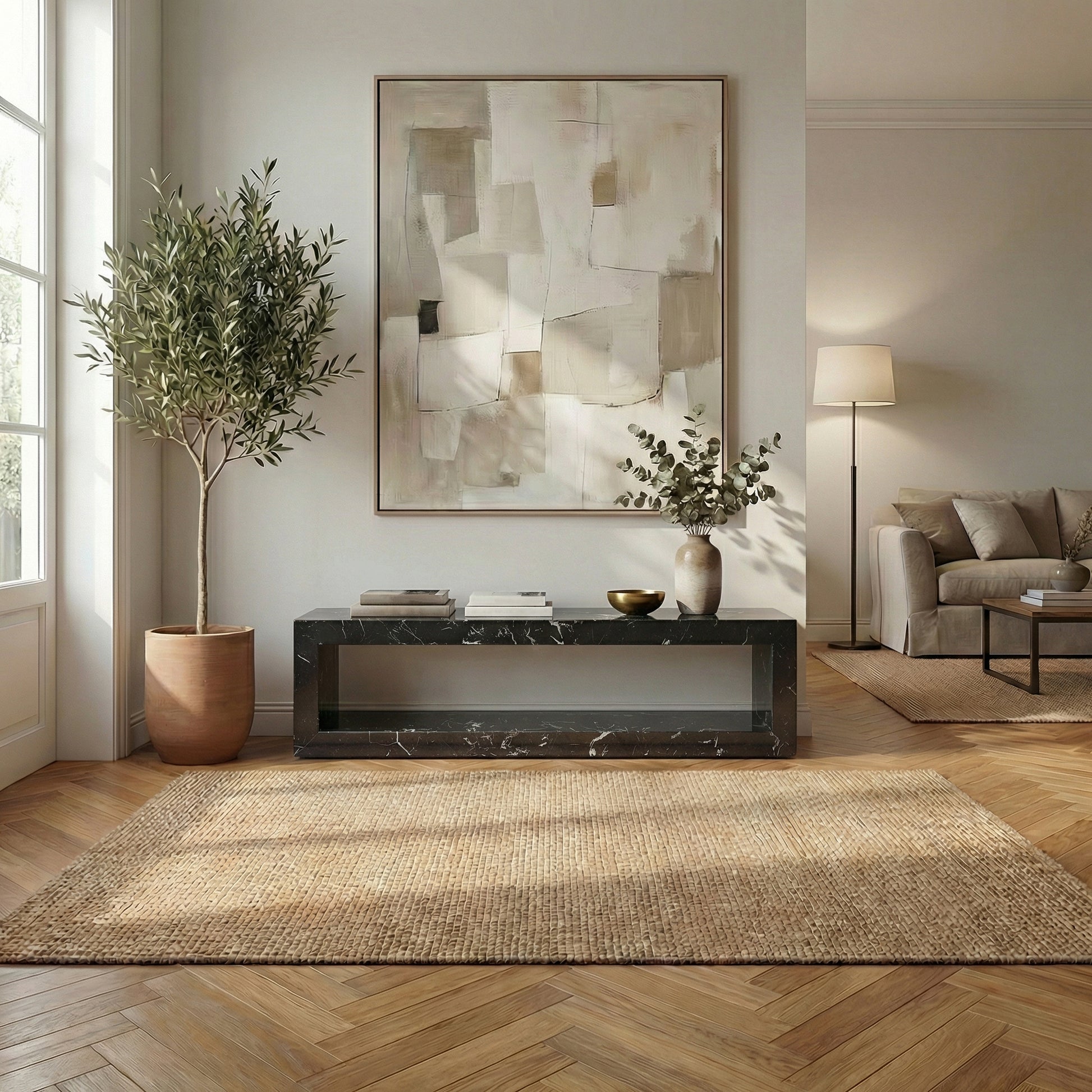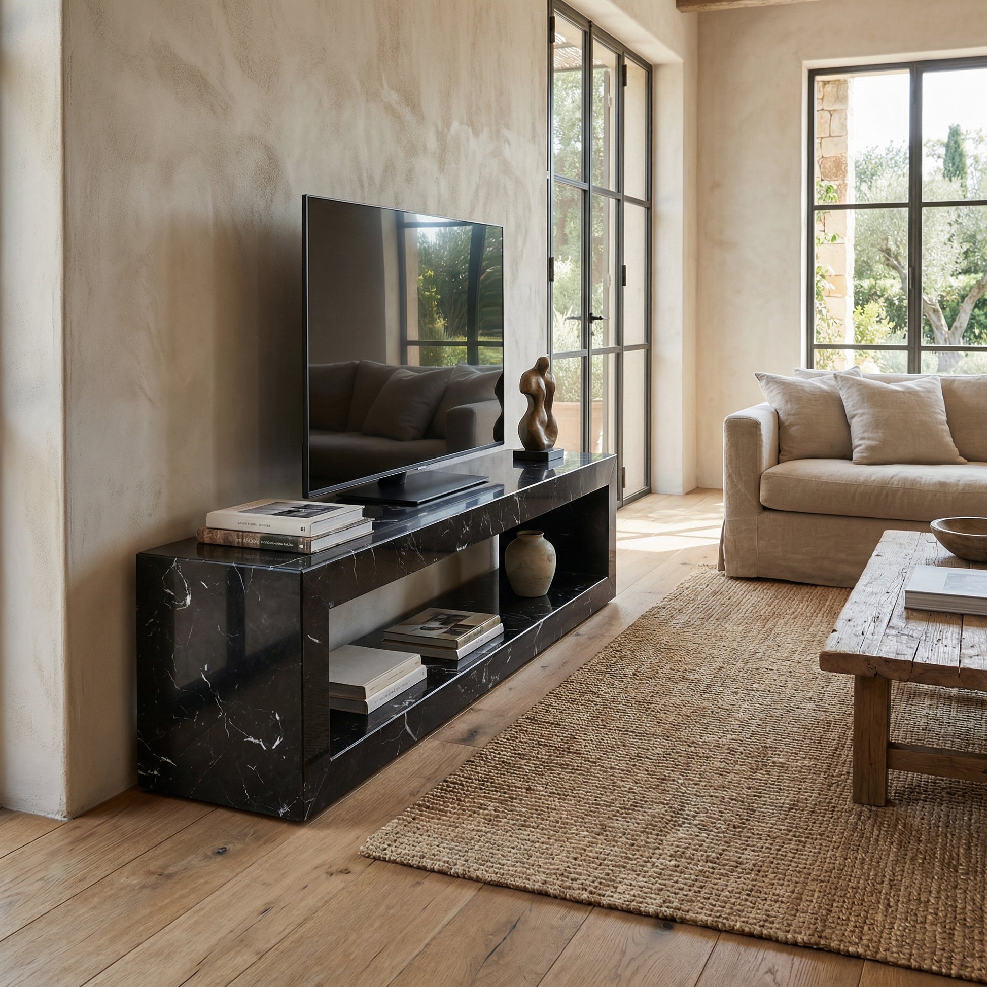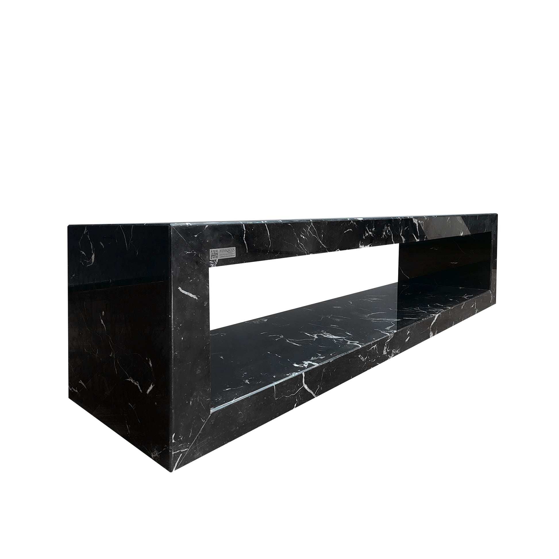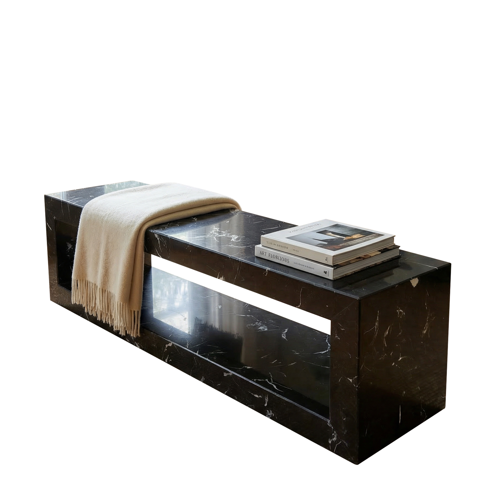 Each piece is meticulously handcrafted, highlighting the inherent beauty of black marble. Subtle variations in veining and tone ensure that no two benches are exactly alike. The polished surface enhances the stone’s depth while offering durability suitable for everyday use. Despite its bold materiality, the open base introduces lightness and allows for layered styling with books, décor objects, or baskets beneath.