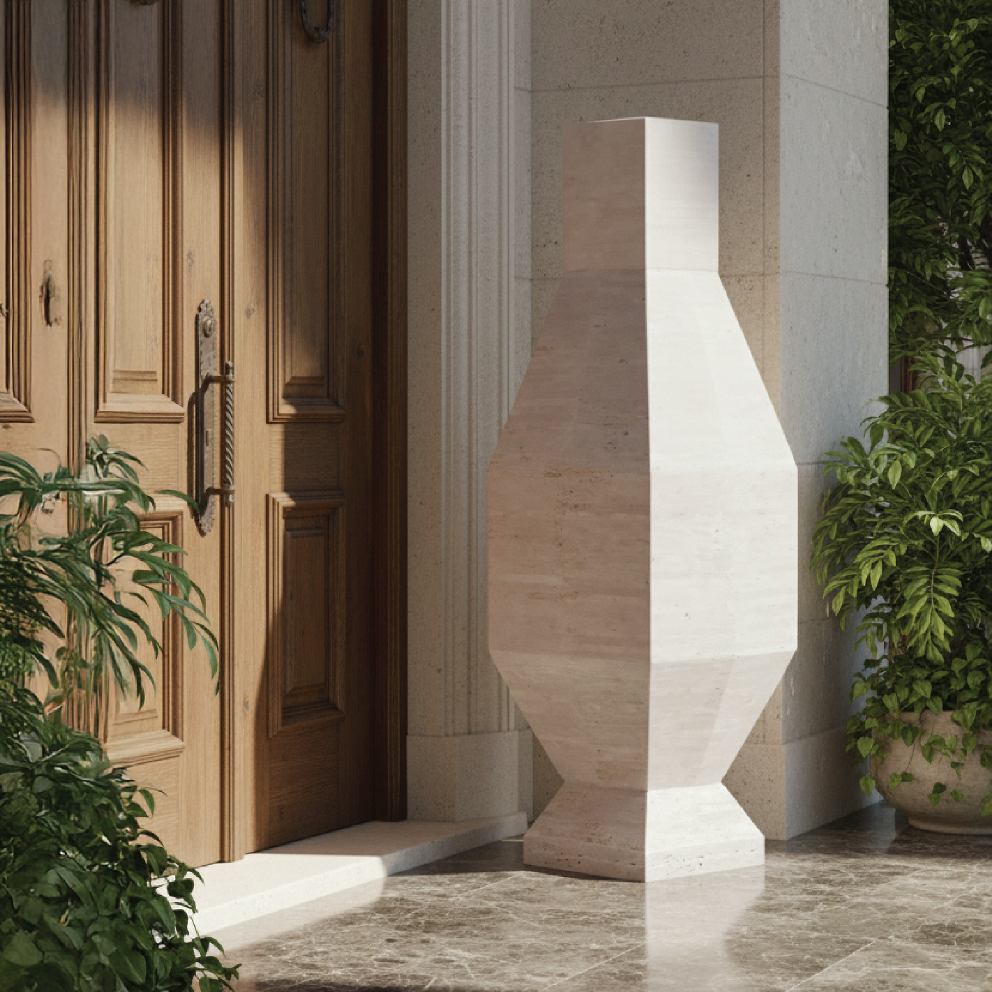 The Octa Grande Travertine Vase is a monumental expression of architectural beauty—a giant vase sculpted from premium beige travertine to elevate both outdoor and indoor environments with timeless grandeur. Its bold octagonal silhouette, refined faceted surfaces, and warm earthy tones create a commanding presence, blending modern minimalism with classic stone craftsmanship.