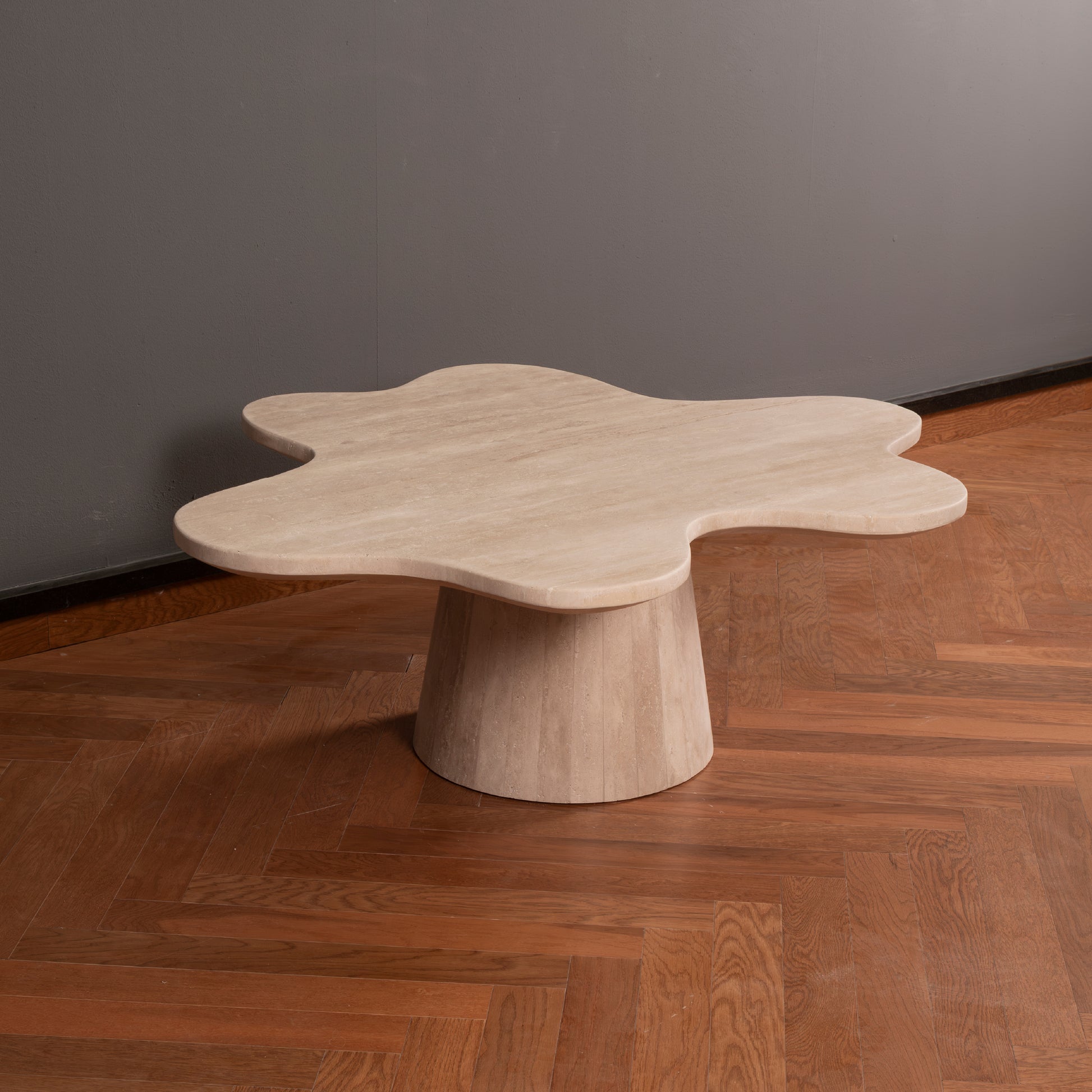 The Petalo Travertine Coffee Table captures the poetry of nature in stone. Inspired by the gentle curves of a blooming flower, its sculptural top unfolds gracefully above a solid circular base, forming a harmonious balance between strength and softness. Each petal-like contour is carefully refined, revealing the tactile beauty of filled beige travertine — a stone celebrated for its warmth, texture, and timeless appeal.