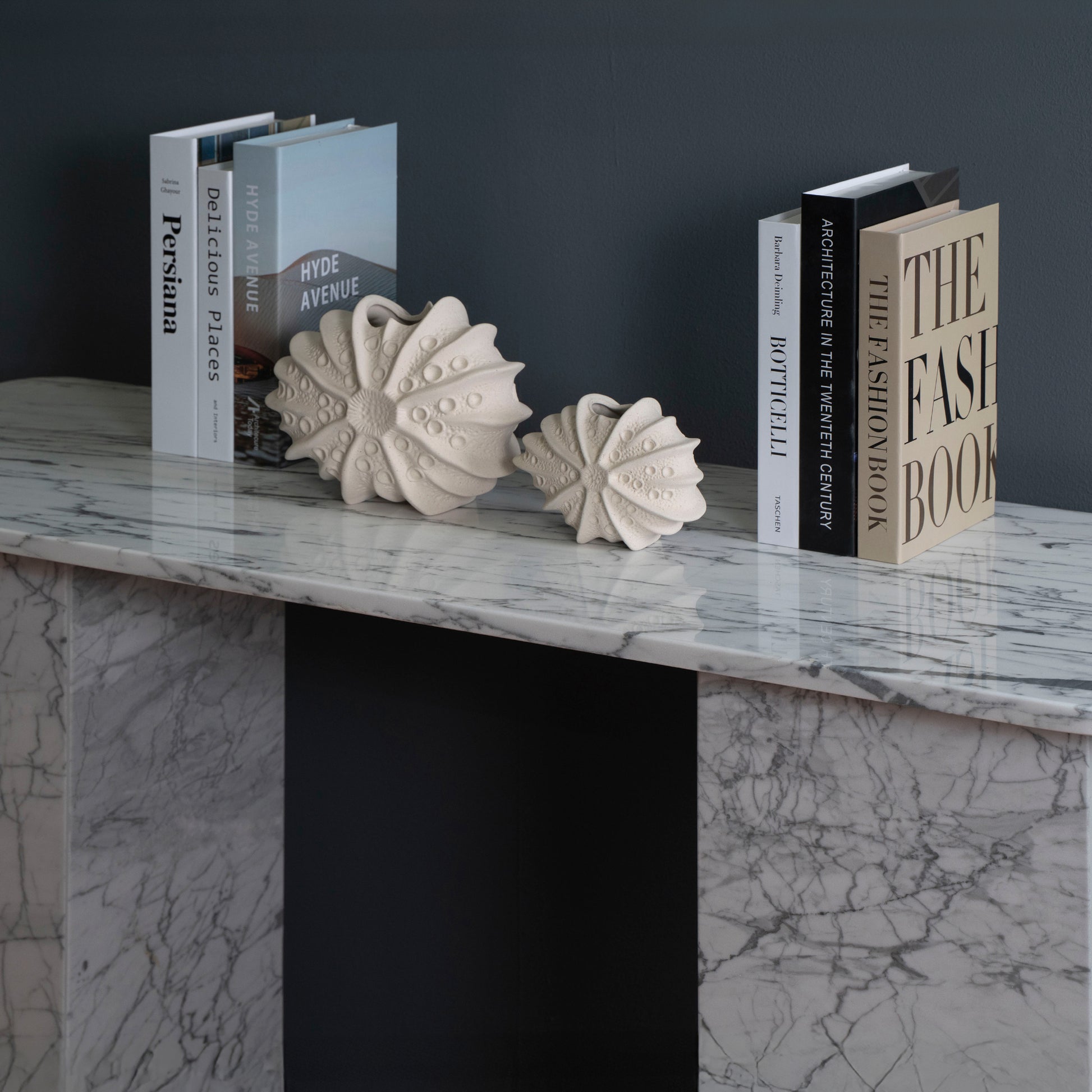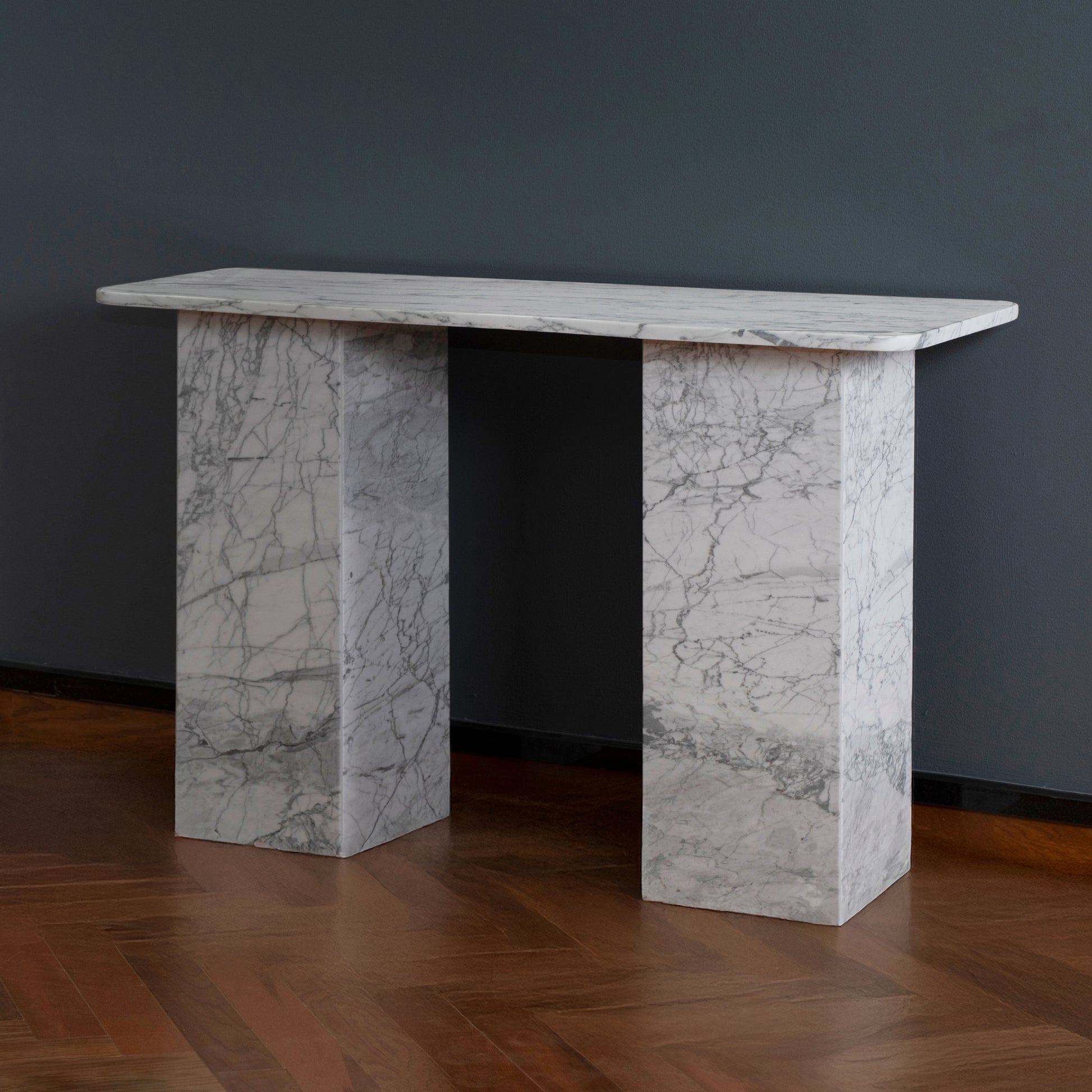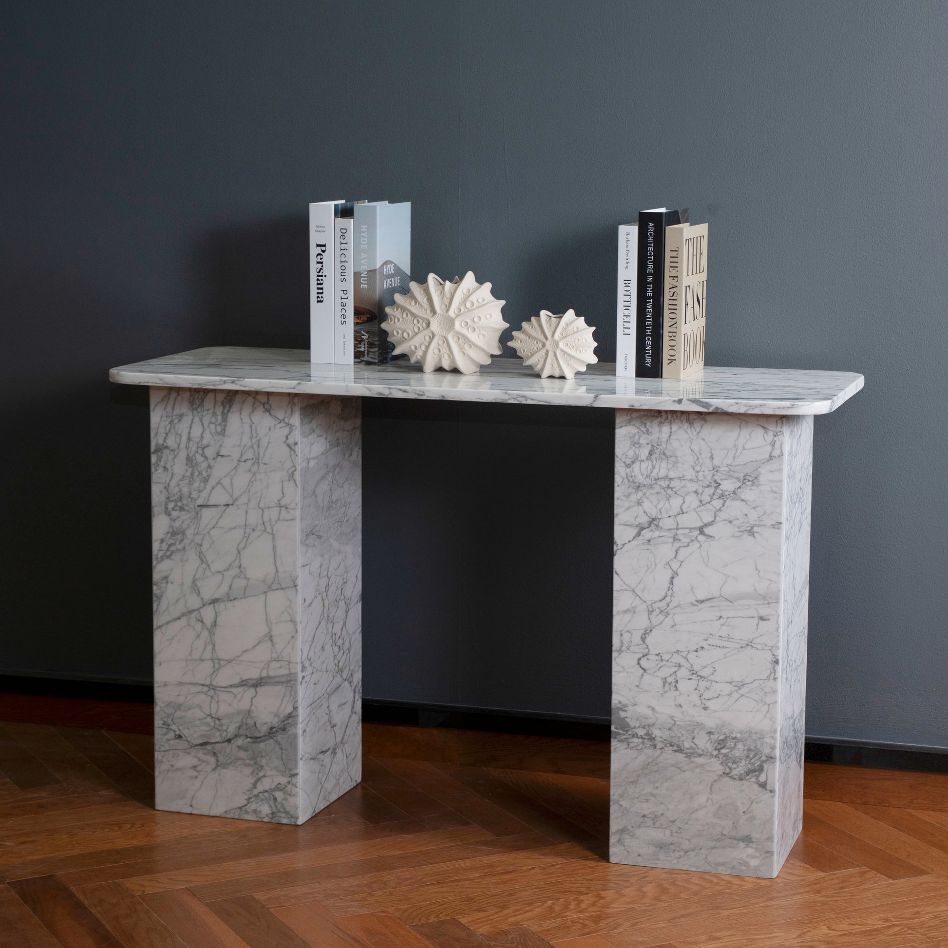 The Sierra Grey Vein Marble Console is a refined expression of minimalism elevated through natural stone artistry. Handcrafted from premium Statuario Marble, it features striking grey veining that flows across the surface like a painted landscape, ensuring that each console is completely unique. Its rounded-edge top rests on two solid marble legs, creating a clean, architectural silhouette that embodies balance, stability, and understated luxury.