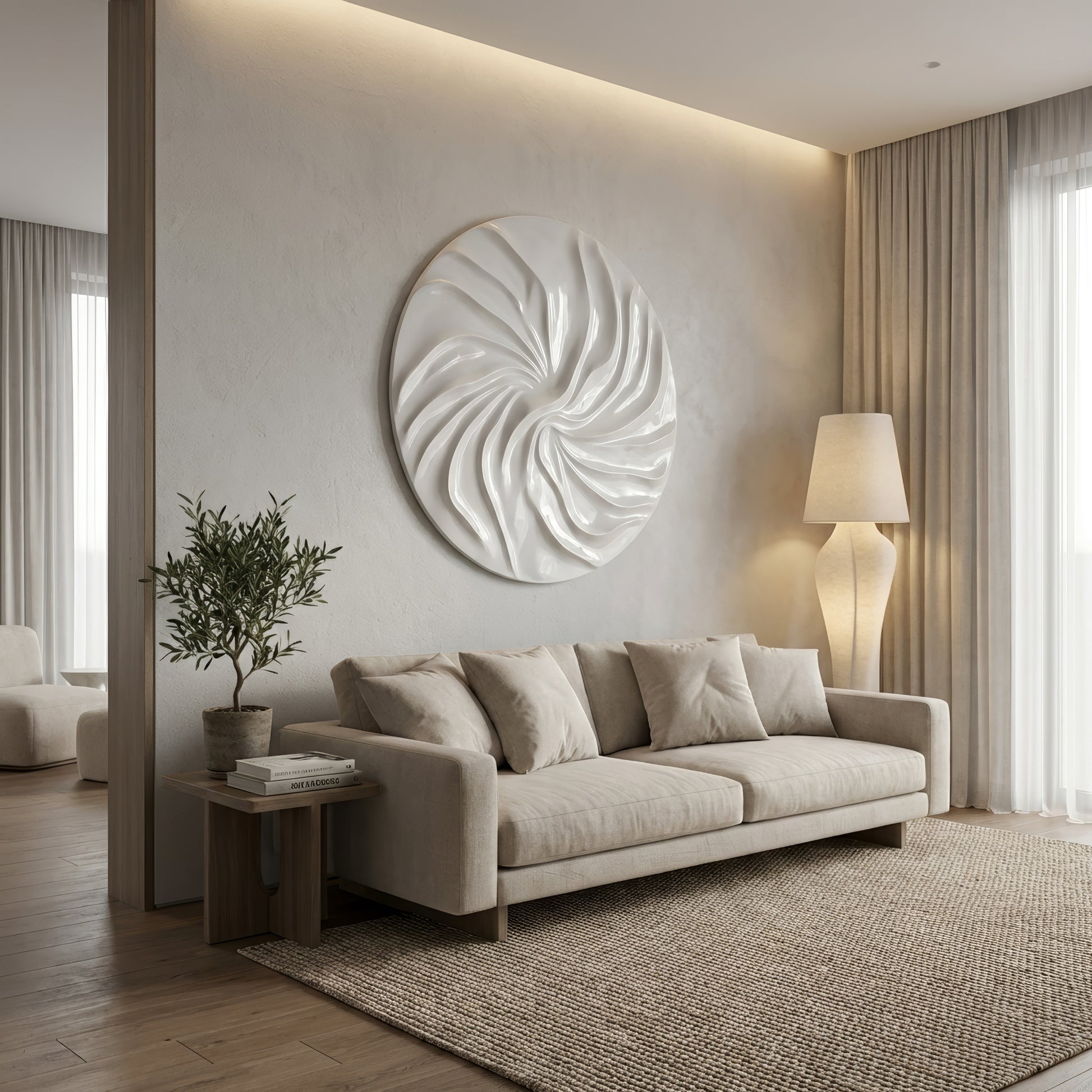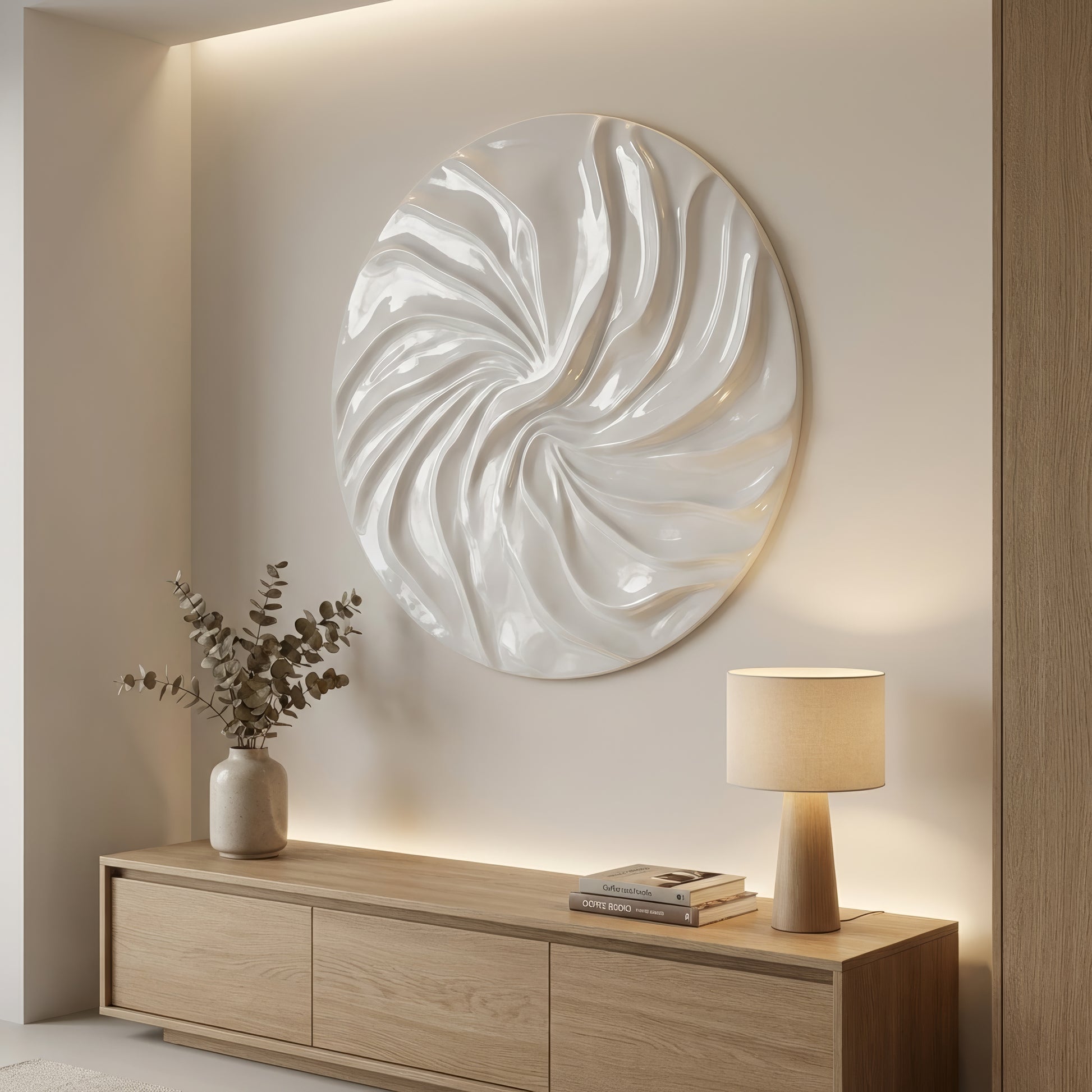 This circular wall art piece captures the elegance of movement through a refined swirl composition. Designed with flowing, spiral-inspired contours, the sculpted surface draws the eye inward, creating a dynamic sense of depth and rotation. The smooth, continuous curves form a harmonious vortex pattern, offering both softness and visual impact within a perfectly balanced circular frame.