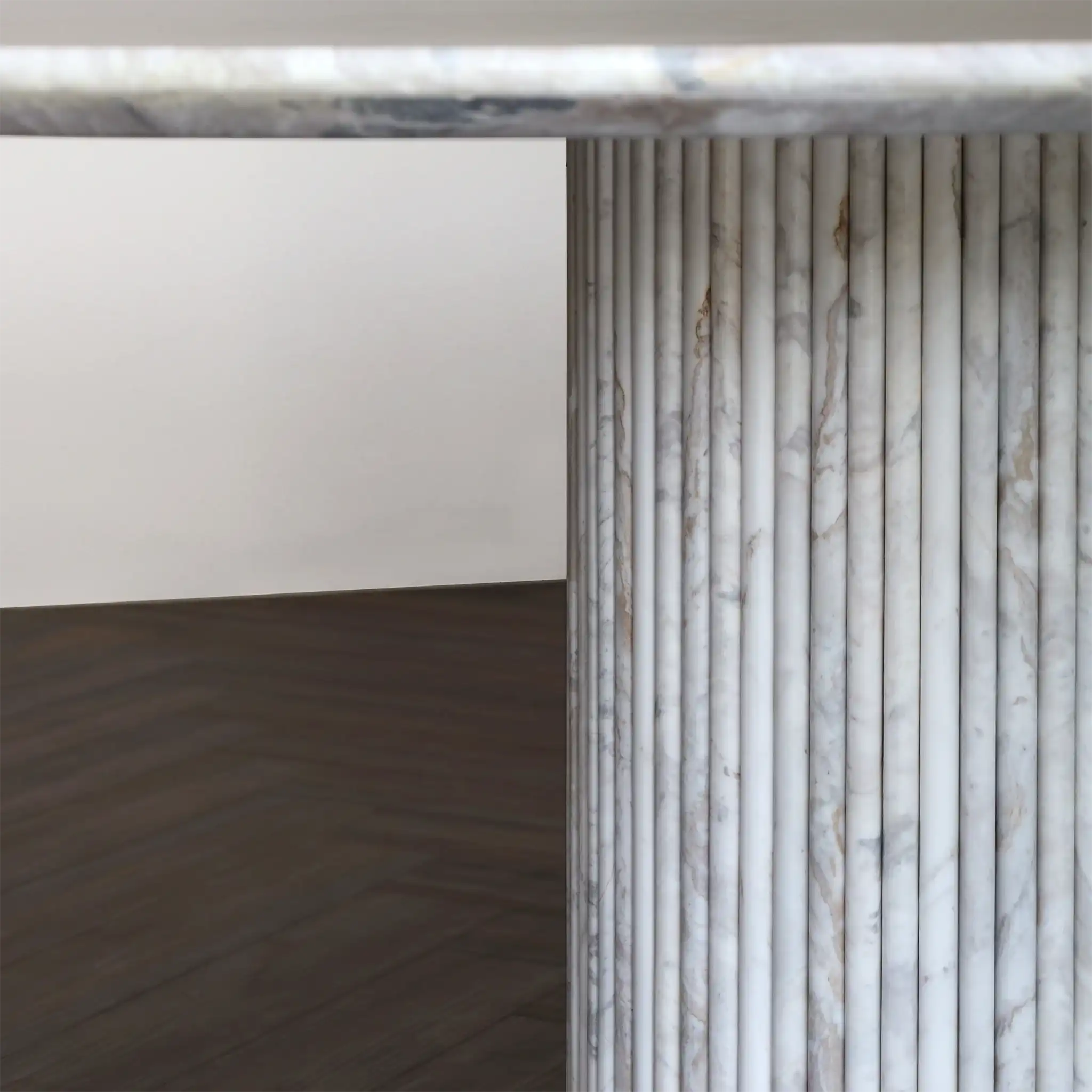 At the heart of its design is a bold, fluted oval pedestal base, carefully carved to create rhythmic vertical lines that add depth, texture, and architectural sophistication. The fluted detailing enhances the table’s sculptural quality while providing a sturdy foundation with visual lightness.